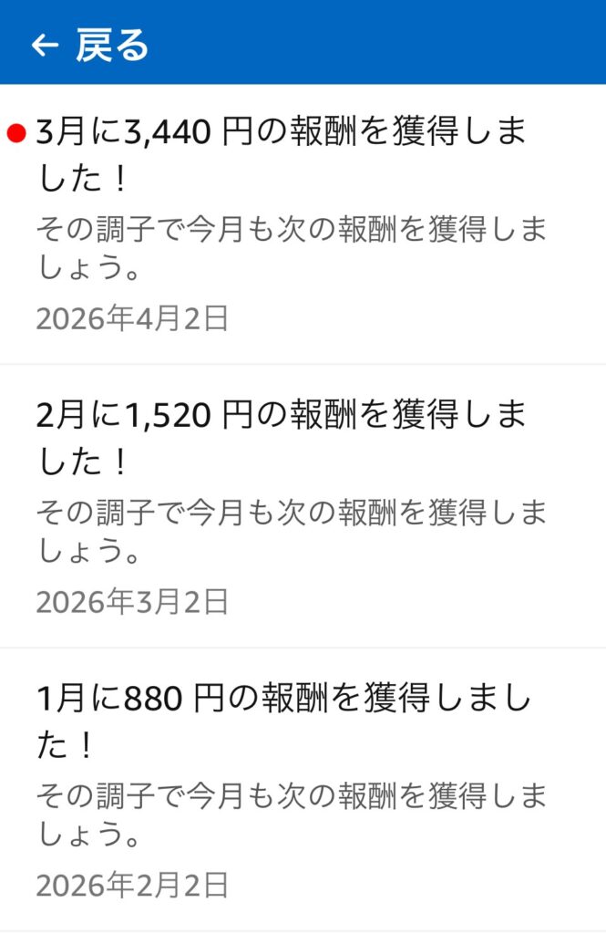 2026年、3月は 3440円、2月は 1520円、1月は 880円のAmazonギフト券を獲得しています。