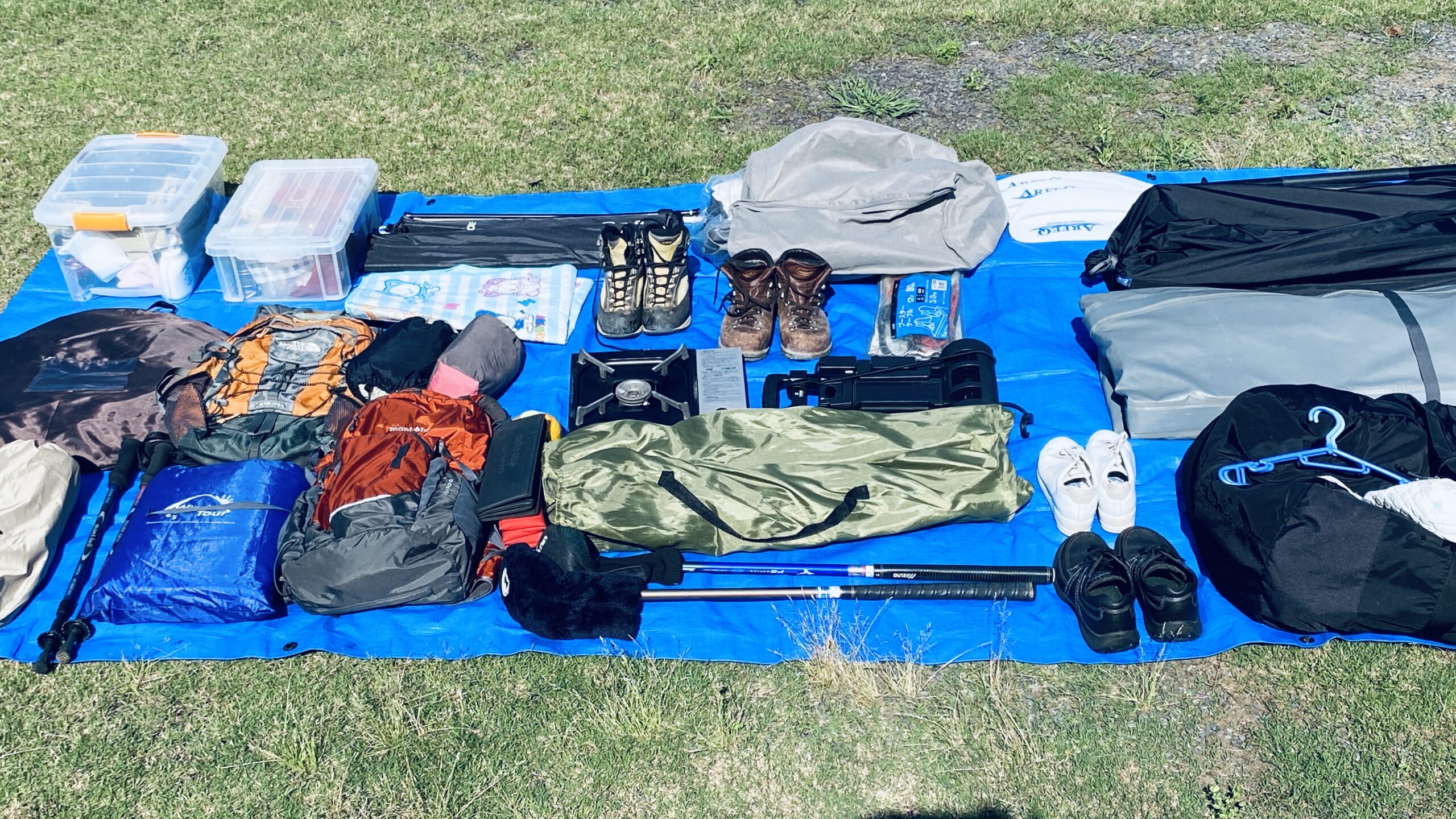 ポタ電とIHヒーター、ガスコンロにフライパン、炊飯器に電気ポット食器類。テントに寝袋、マットレス、椅子にテーブル。ノートパソコンにアクションカメラ、コード類。カヤックにパークゴルフセット、登山道具一式など