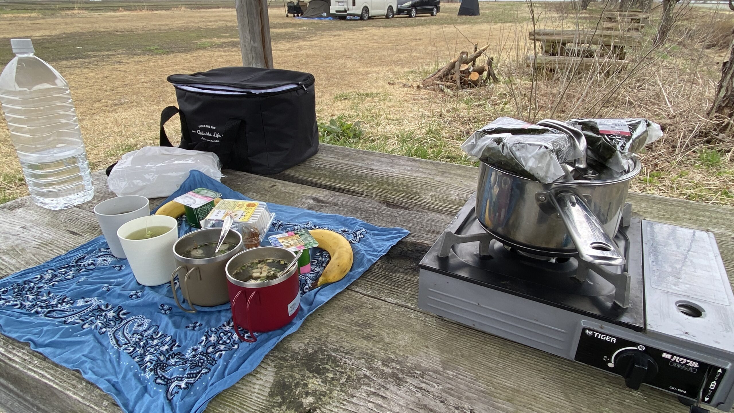 オートキャンプの方々がすでにいましたが、私たちも東屋をお借りして簡単な朝食。