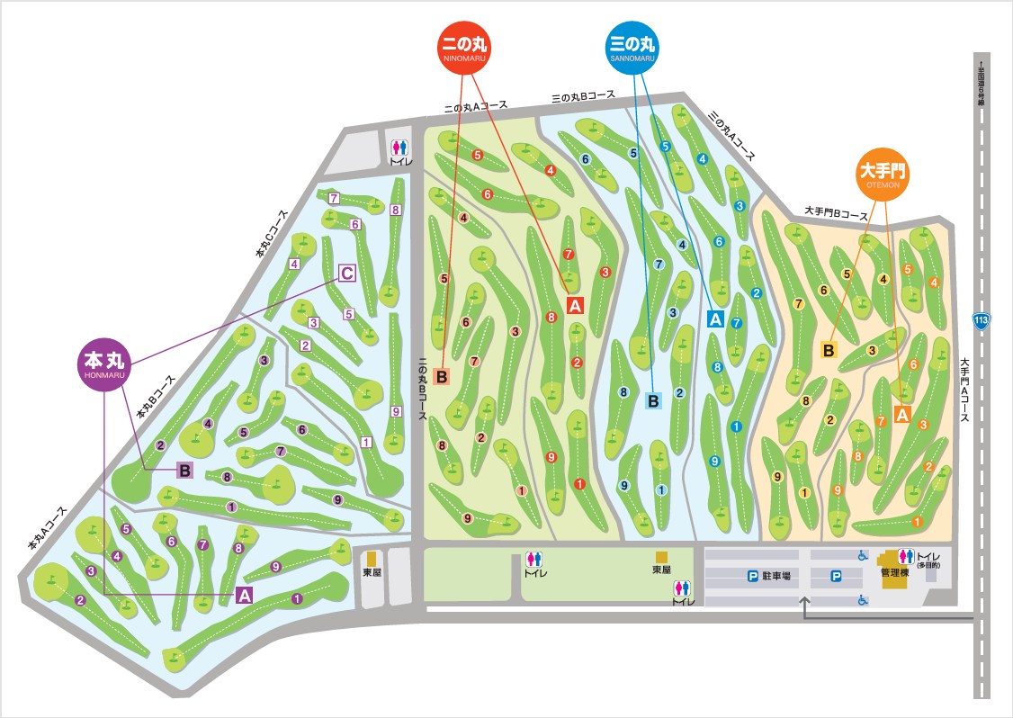 - コース構成:「本丸」「二の丸」「三の丸」「大手門」それぞれA〜Cコース