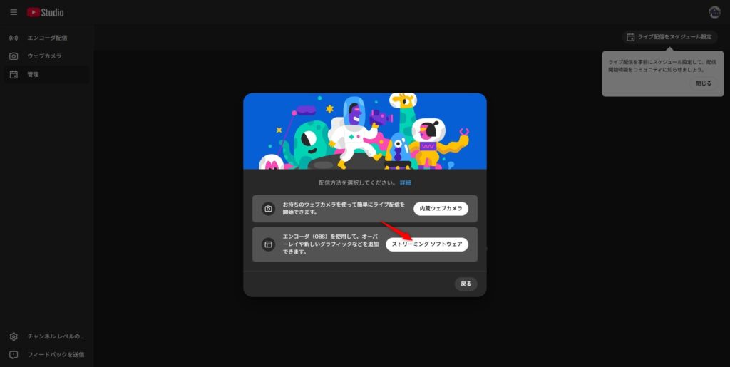 - 自動で「エンコーダ配信の管理画面」に入る仕組み