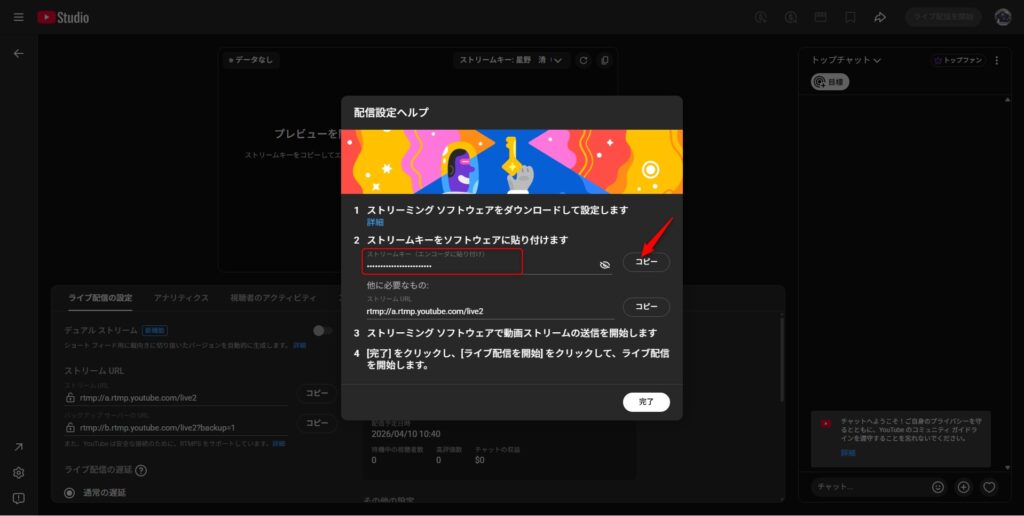 もしそれでも表示されない場合は、 「新しいストリームキーを作成」から新規キーを作れば解決します。