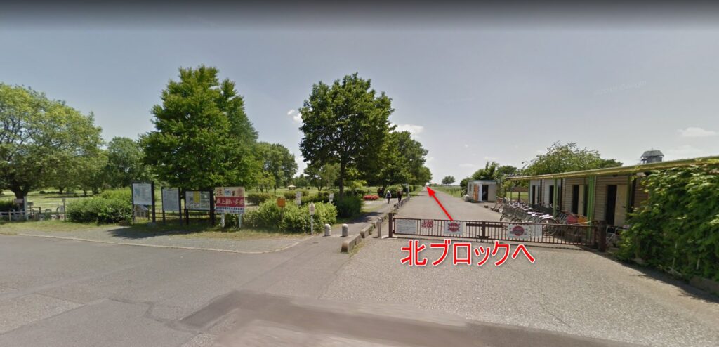 レンタルサイクルセンターから北ブロック方面へ、舗装道路ですが距離があるので、カートがお薦めです。