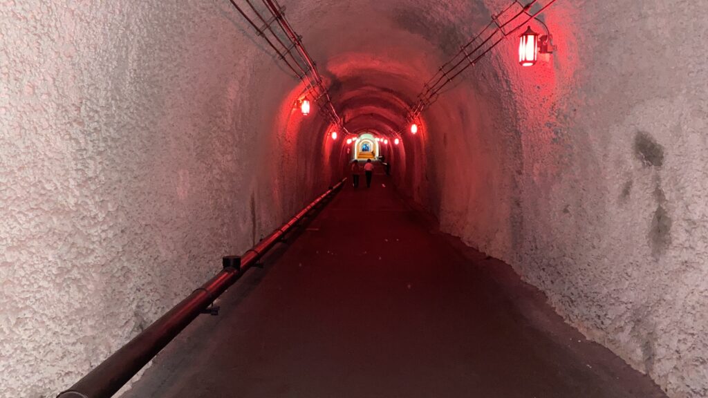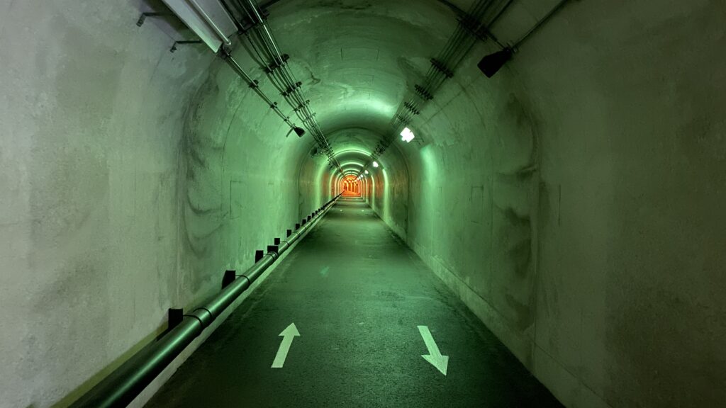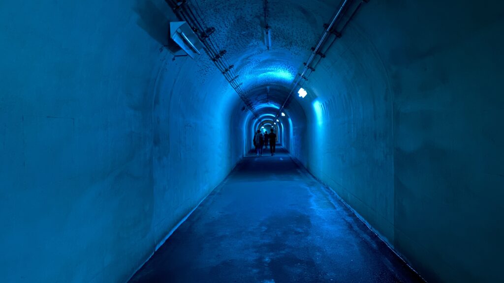 清津峡渓谷トンネルの中は、赤・青・緑のライトアップが施され、歩くたびに違った雰囲気を楽しめます。特に終点にある「鏡のテラス」は、渓谷がガラスに映し出され、まるで渓谷が空中に浮かんでいるかのよう。写真を撮るには絶好のスポットで、私も思わず何枚もシャッターを切りました。また、トンネル内は舗装されており、歩きやすく安全なので家族連れでも安心です。