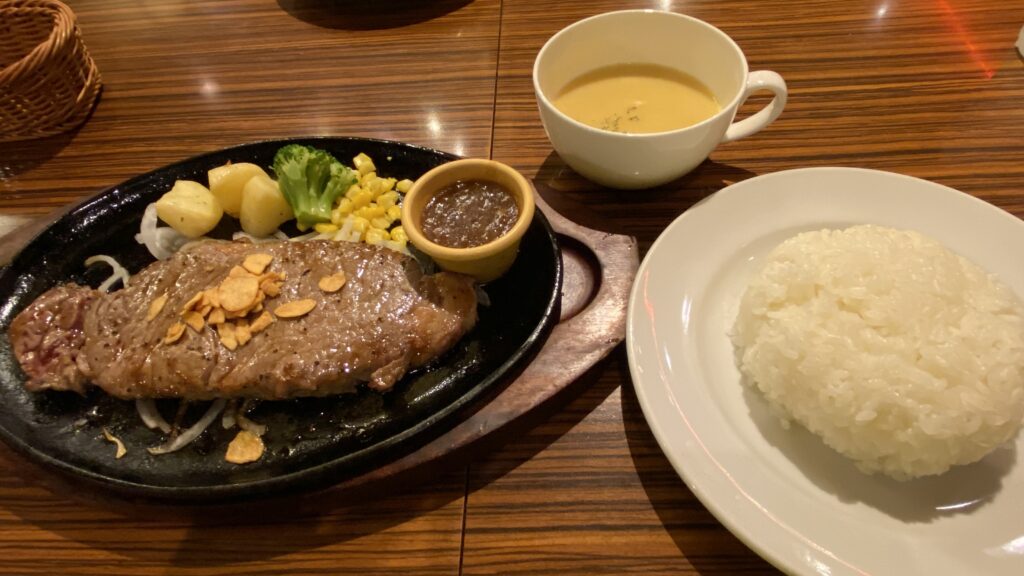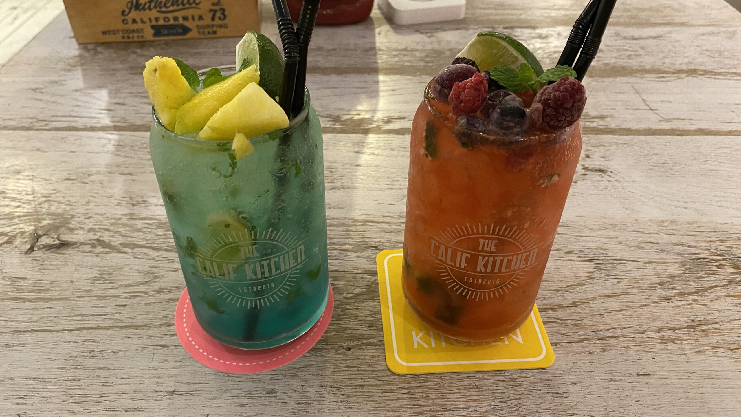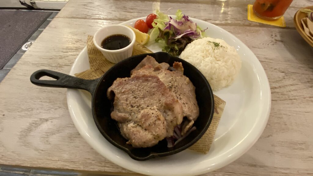 - 夕食は「ザ・カリフキッチン沖縄」でハンバーグ&チーズエッグ、ポークジンジャー、ノンアルコールモヒートを堪能