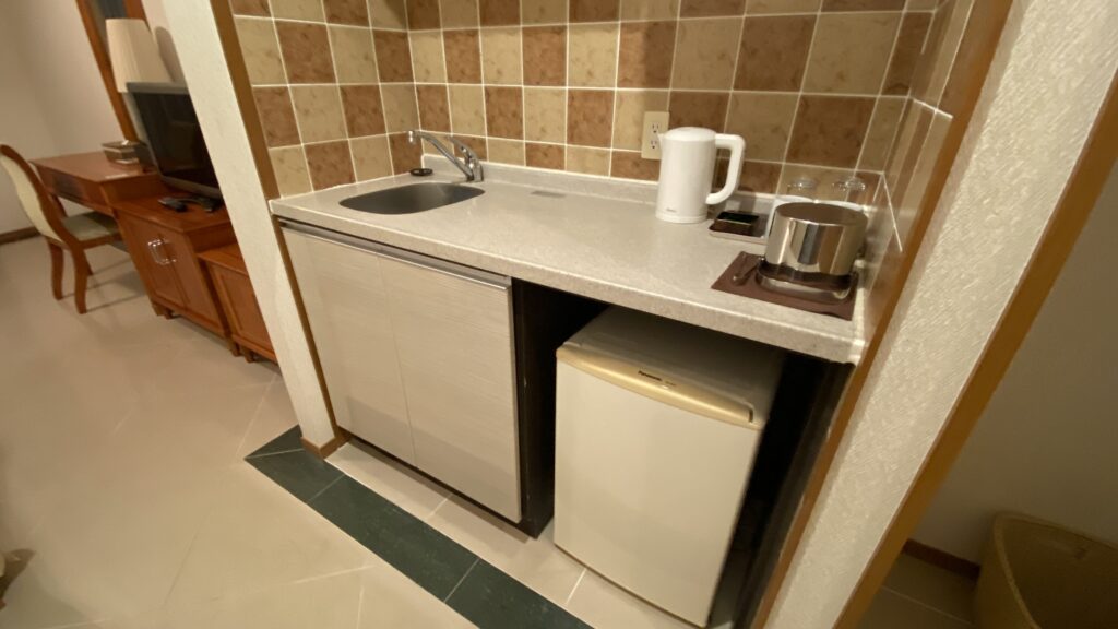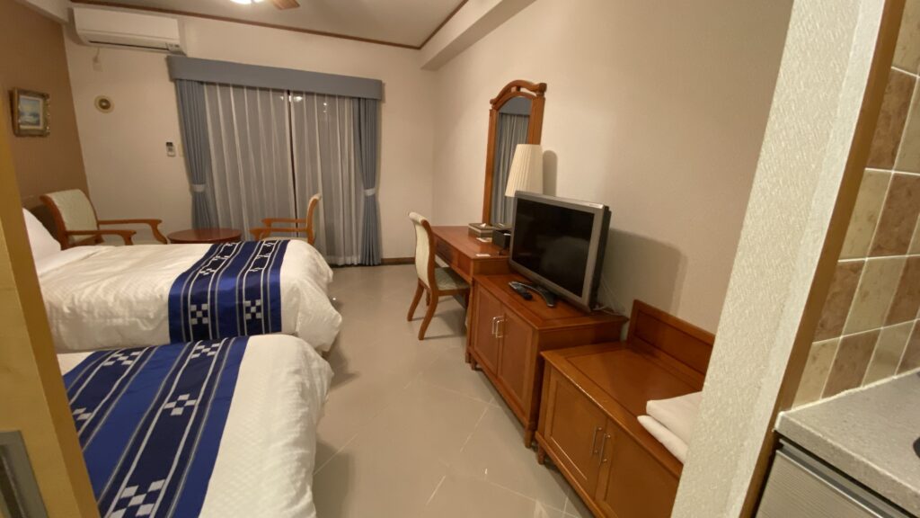 - 部屋から海が一望でき、キッチン・冷蔵庫・テレビ完備