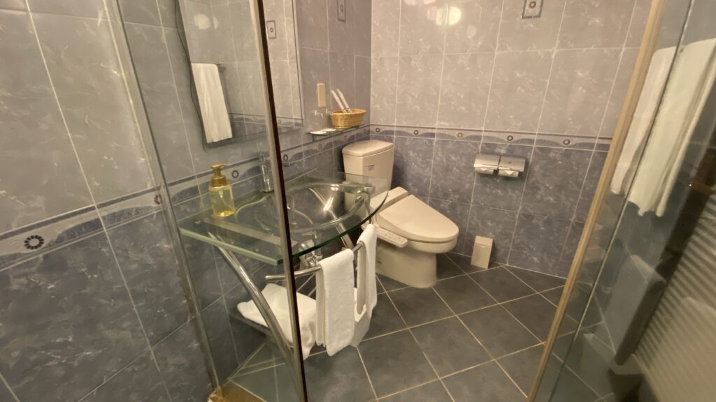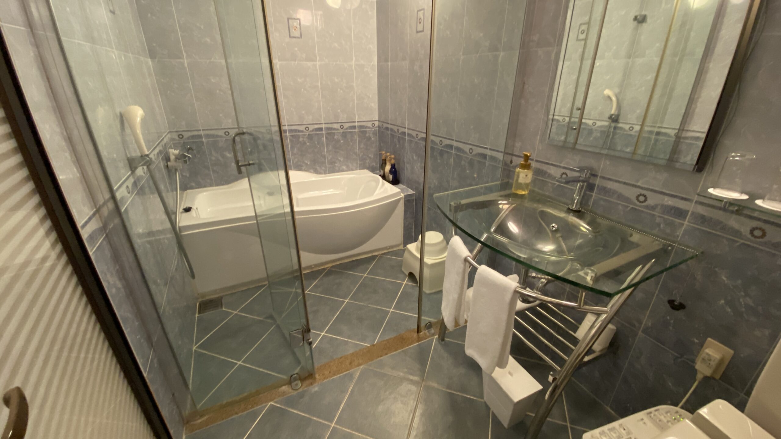 - 浴室はガラス張りで明るく広々、コインランドリーも利用可