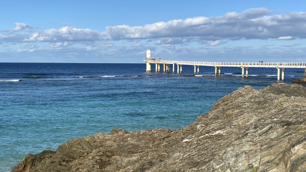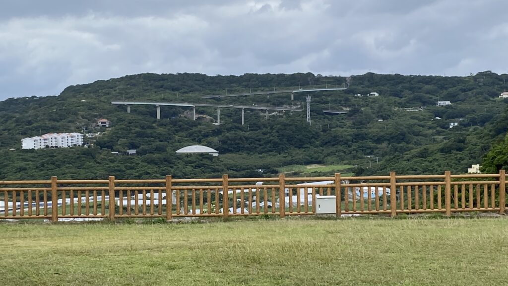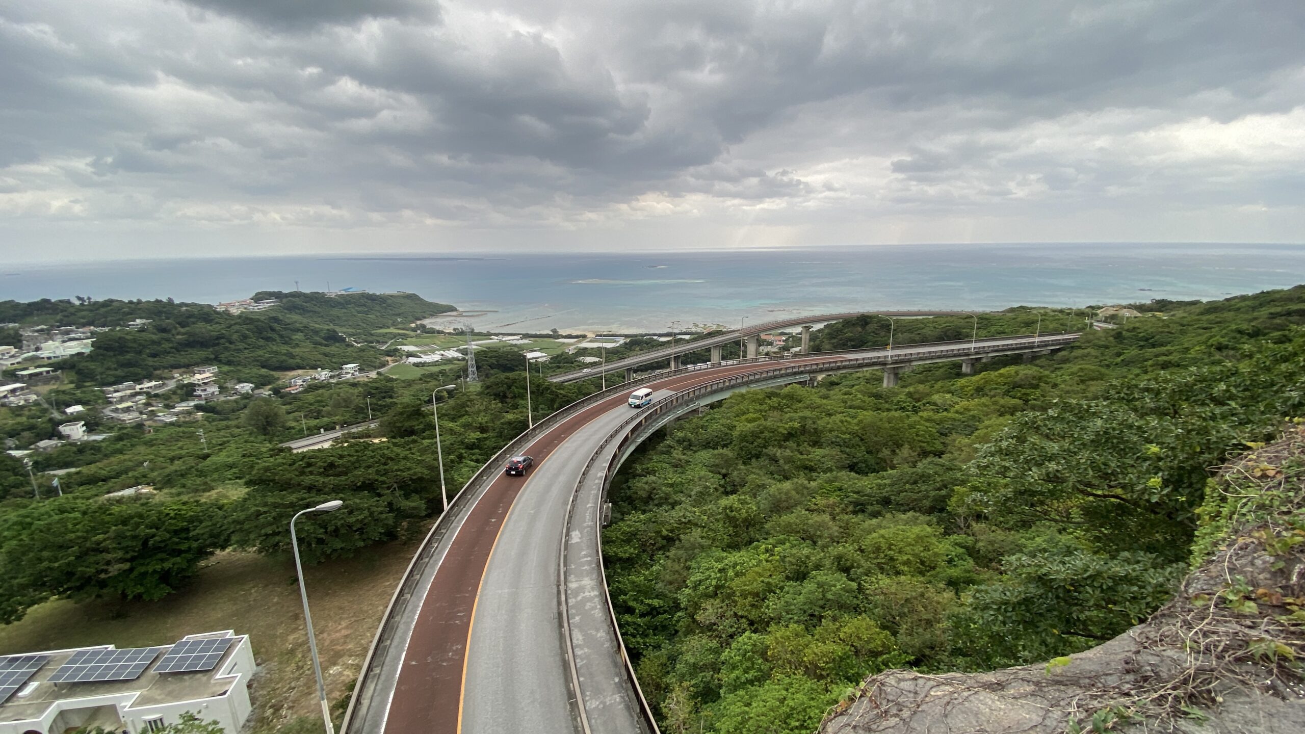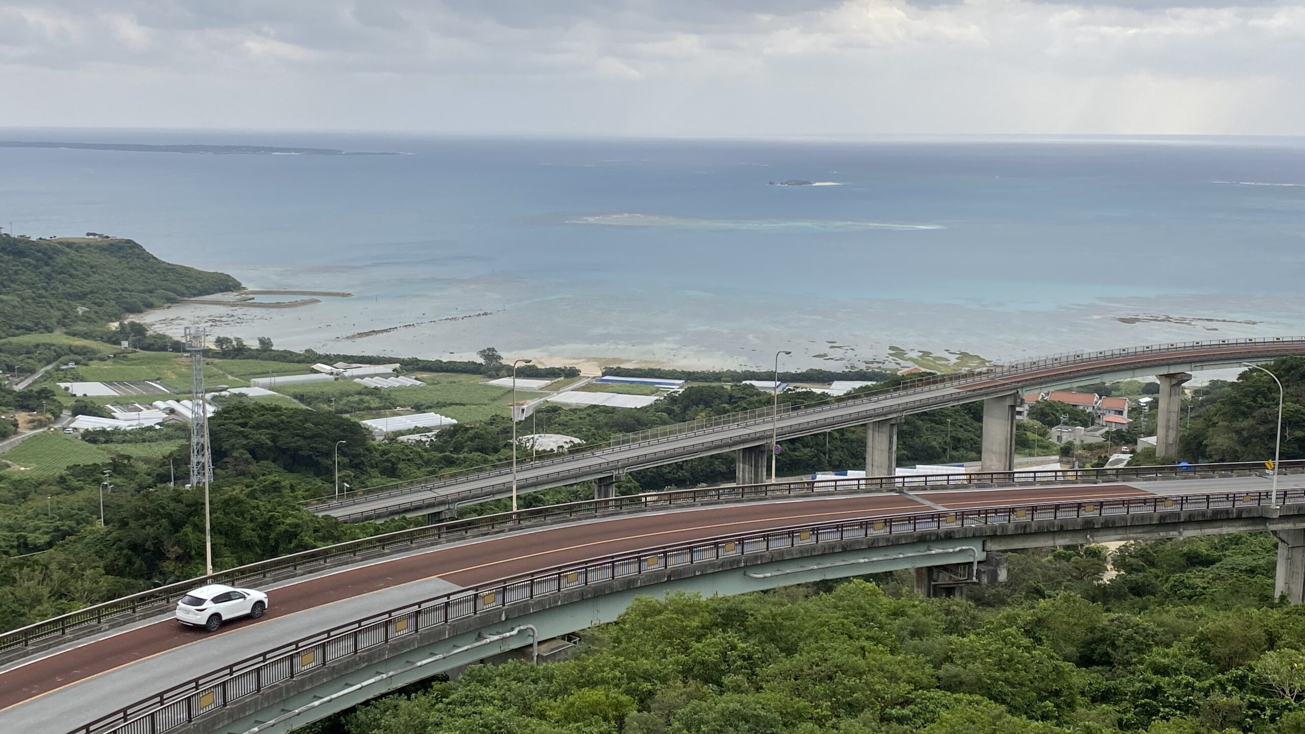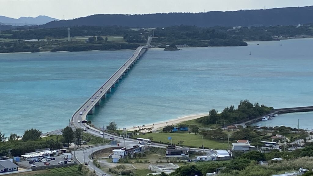 次はニライカナイ橋へ。山道を上ると眼下に広がる南部の海と沖縄の町並みが一望できます。快晴の日には特に青い海と空が印象的で、絶好の写真スポットです。