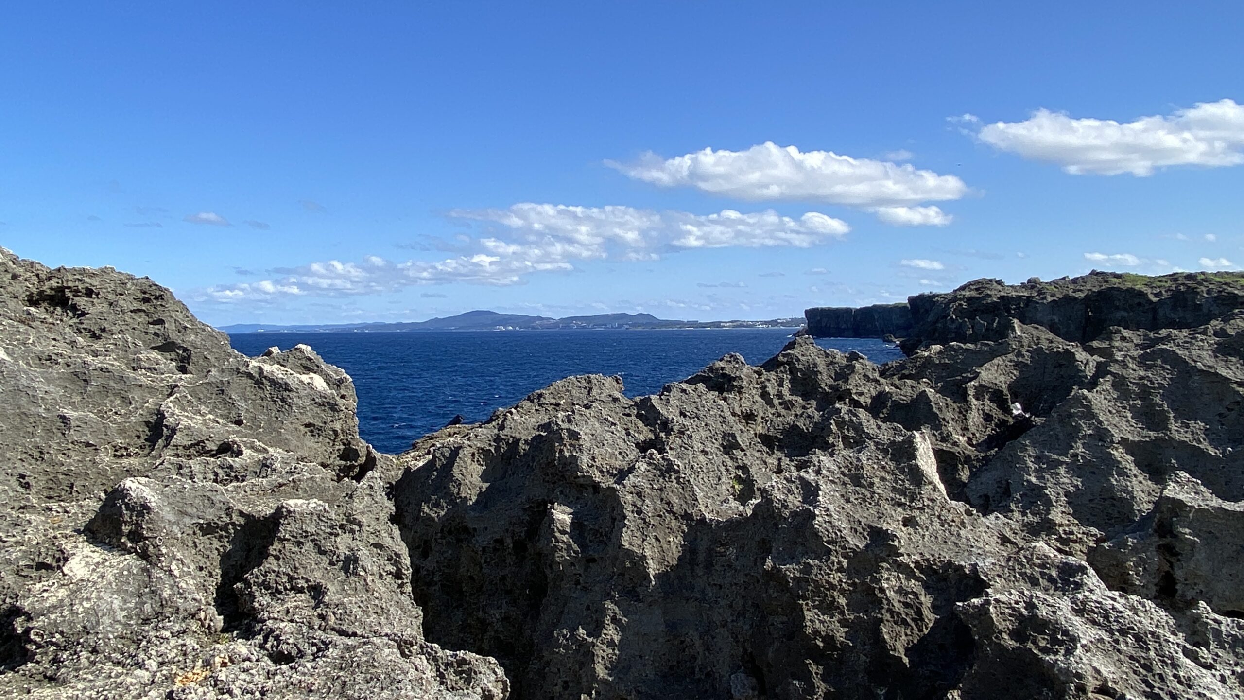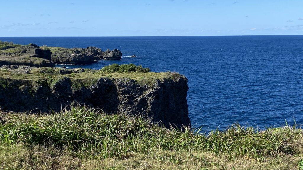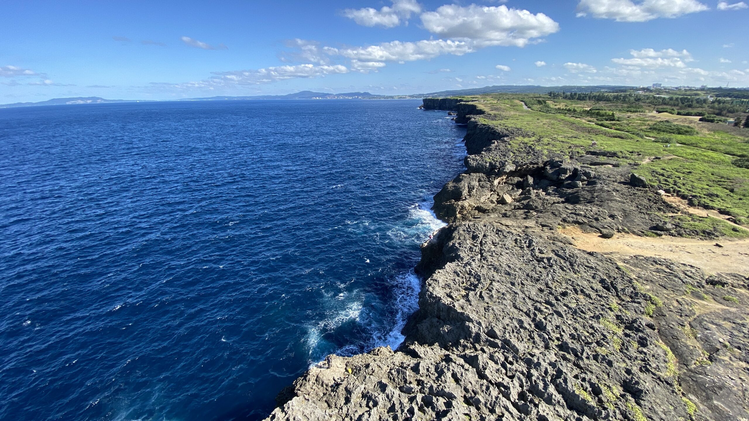 斎場御嶽の後は知念岬へ。海に突き出た岬からの眺望はまさに絶景で、断崖と青い海のコントラストは圧巻です。風が強いので服や髪の乱れに注意しましょう。