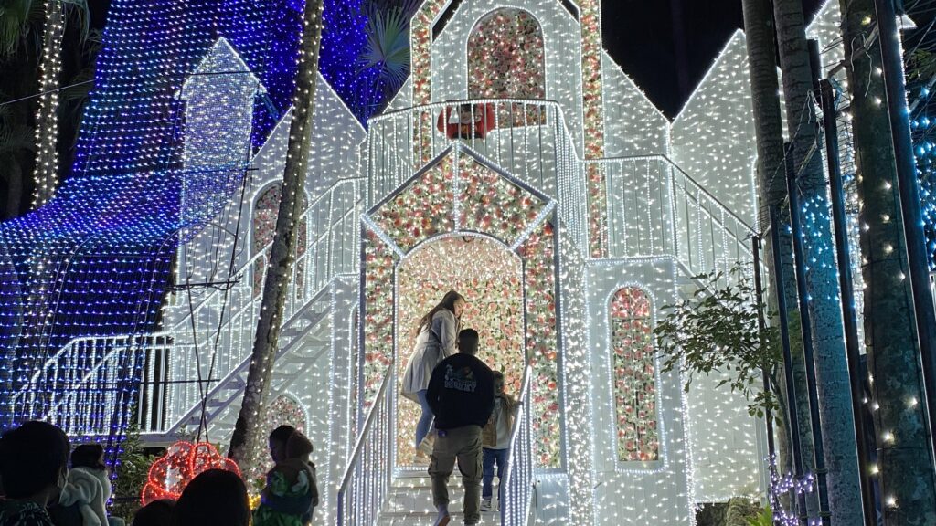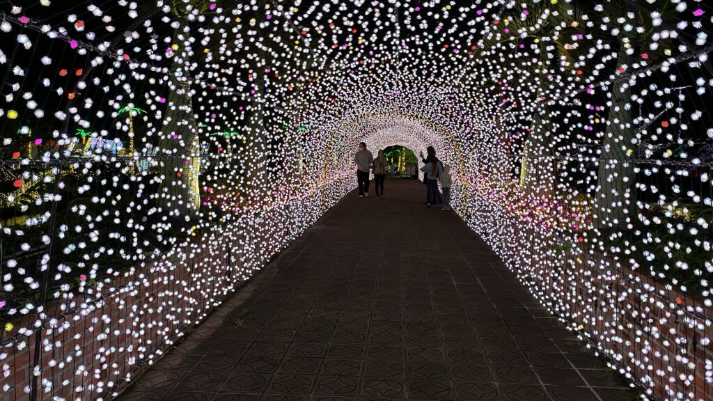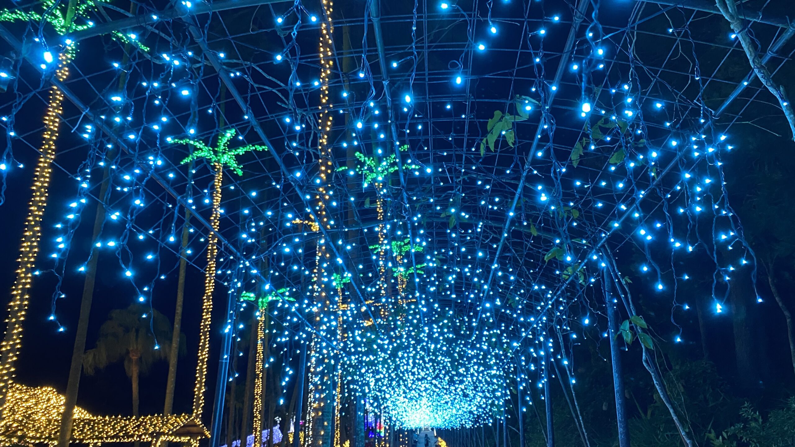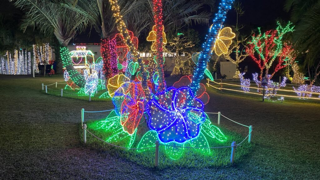 夜は東南植物園を訪問。昼間とは違いライトアップされた園内は幻想的な雰囲気で、沖縄らしい植物や夜景を楽しめます。ここもとくとく5パスを活用するとお得に入園できます。