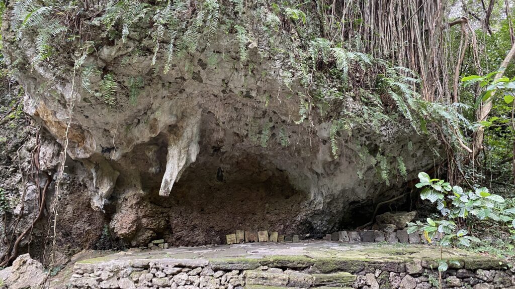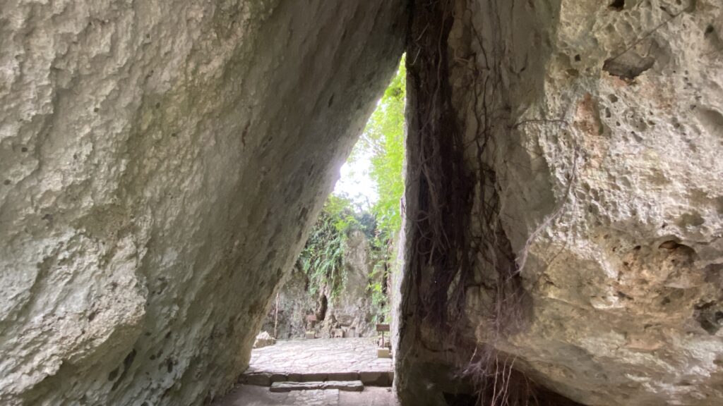 沖縄の聖地、斎場御嶽へも立ち寄りました。琉球王国の祭祀場で、自然と一体になった神聖な雰囲気が魅力です。ここも世界遺産に登録されています。雨の日でも屋外の散策ができ、独特の空気感を体験できます。