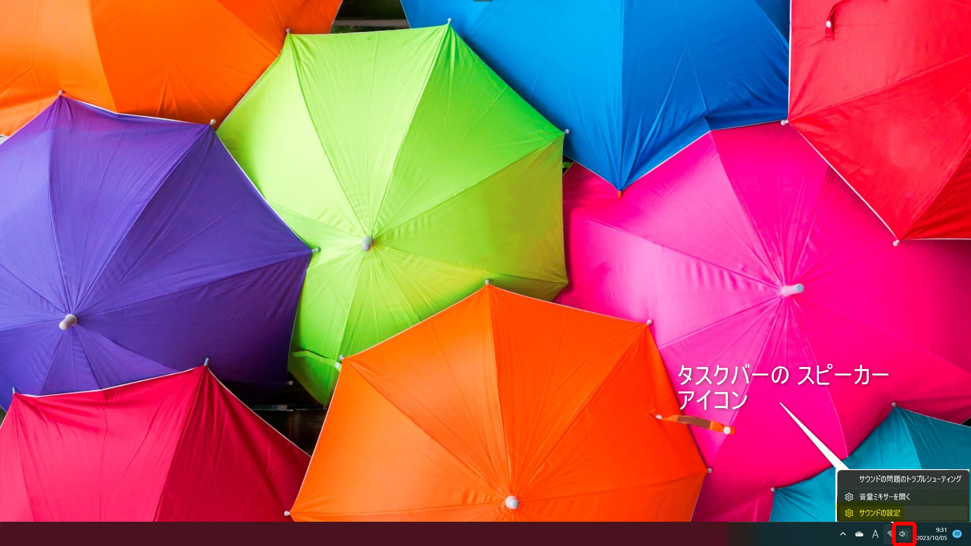 タスクバーの スピーカーアイコンを右クリックして「サウンドの設定」を選択します。