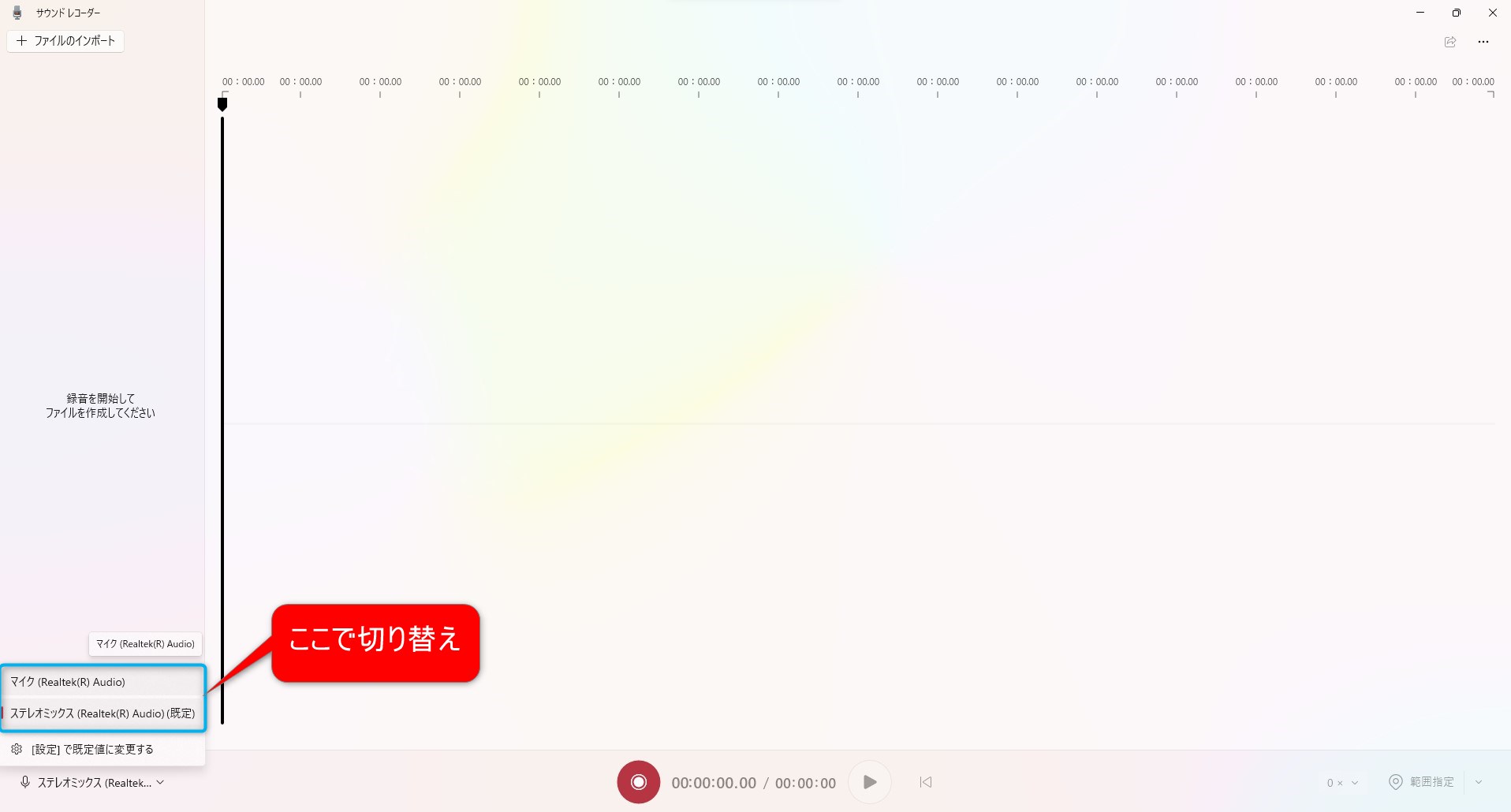 外部マイクから録音するときは左下のプルダウンボタンで切り替えます。