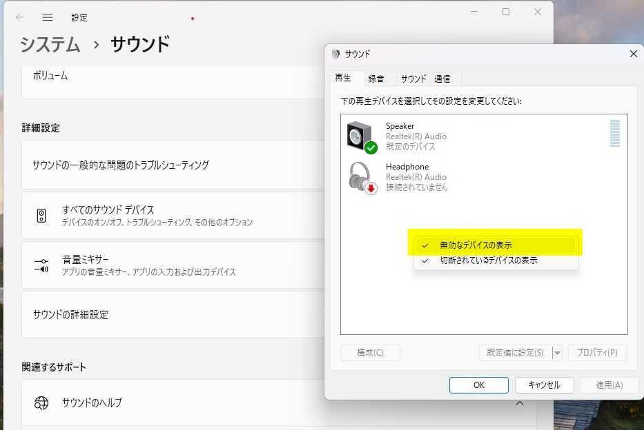 何もない画面上で右クリックして、「無効なデバイスの表示」を選択してOKをクリック