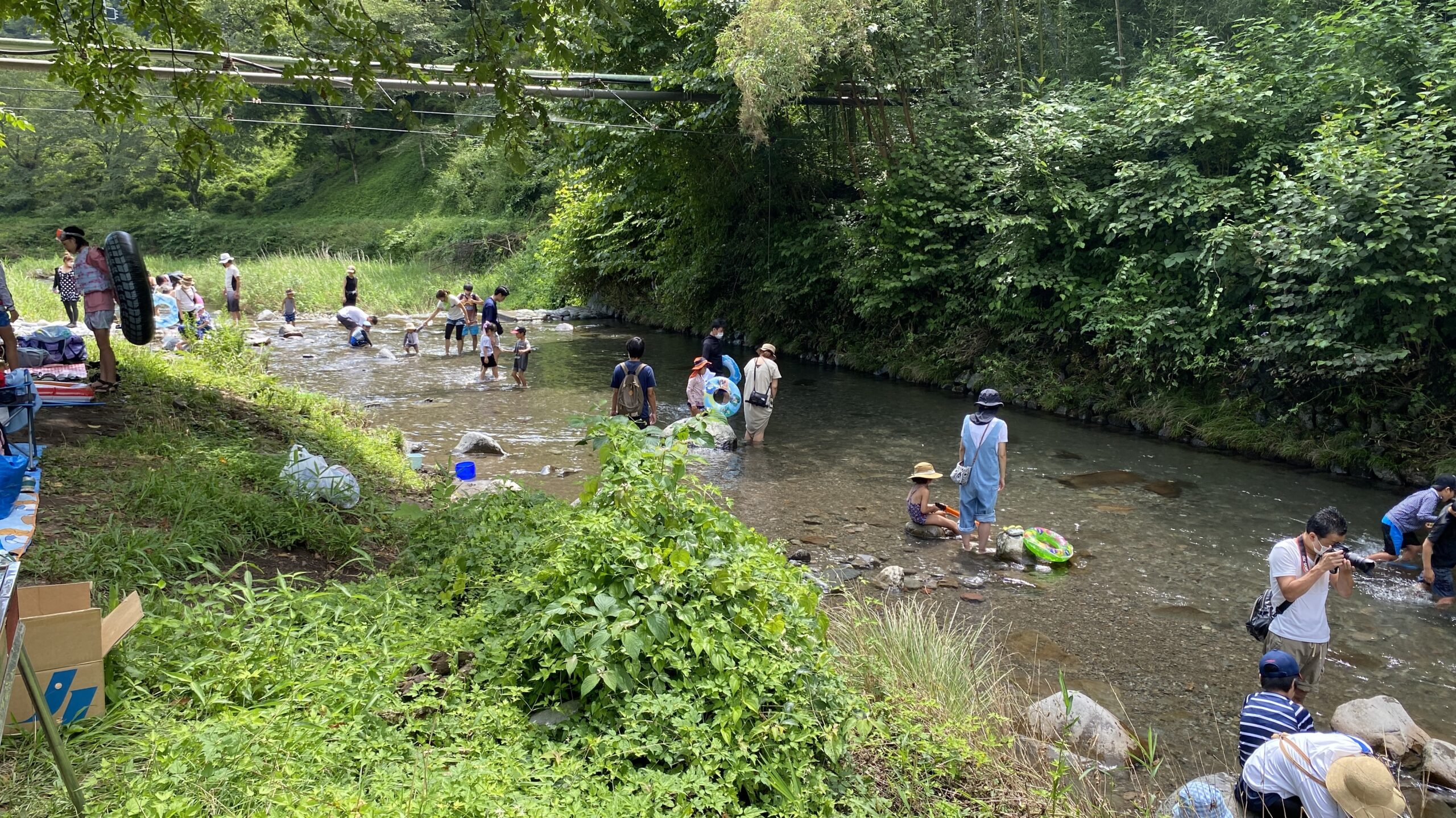 川の上流には滝がありますが、狭い岩に挟まれた急流を越えなければならず、大人でも真っすぐ上流に泳ぐことは簡単ではありません。左右の岩にしがみつきながら進む悪戦苦闘の末、幼稚園児でも滝に到達できた様子には驚かされます。帰りは流れに乗って楽に下ることができ、達成感とともに川遊びを満喫できます。
