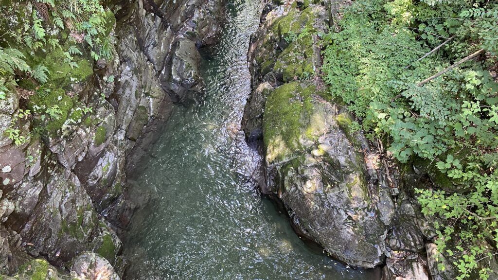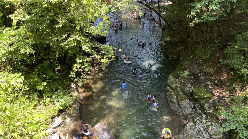 私が訪れた日は、渓谷の川に足を入れただけでその冷たさに思わず息を止めてしまうほどでした。長くは入れませんが、その分一瞬の水遊びが格別に楽しく感じられます。最初は少し勇気がいるダイブも、一度飛べば病みつきになる楽しさです。